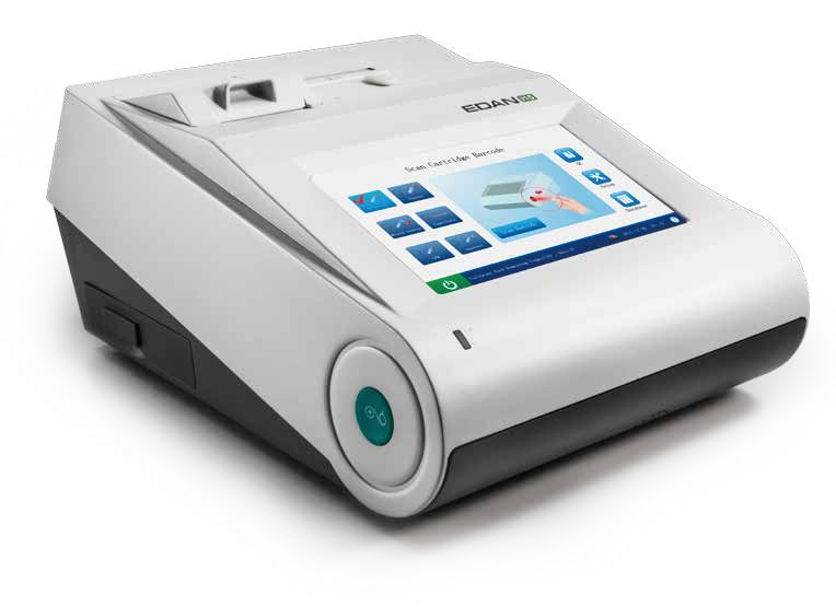 The Edan i15 is a compact, fully integrated blood gas and chemistry analyzer designed for rapid point-of-care testing. It delivers accurate results for blood gases, electrolytes, and metabolites from small sample volumes in about one minute, with a touchscreen interface and portable design.